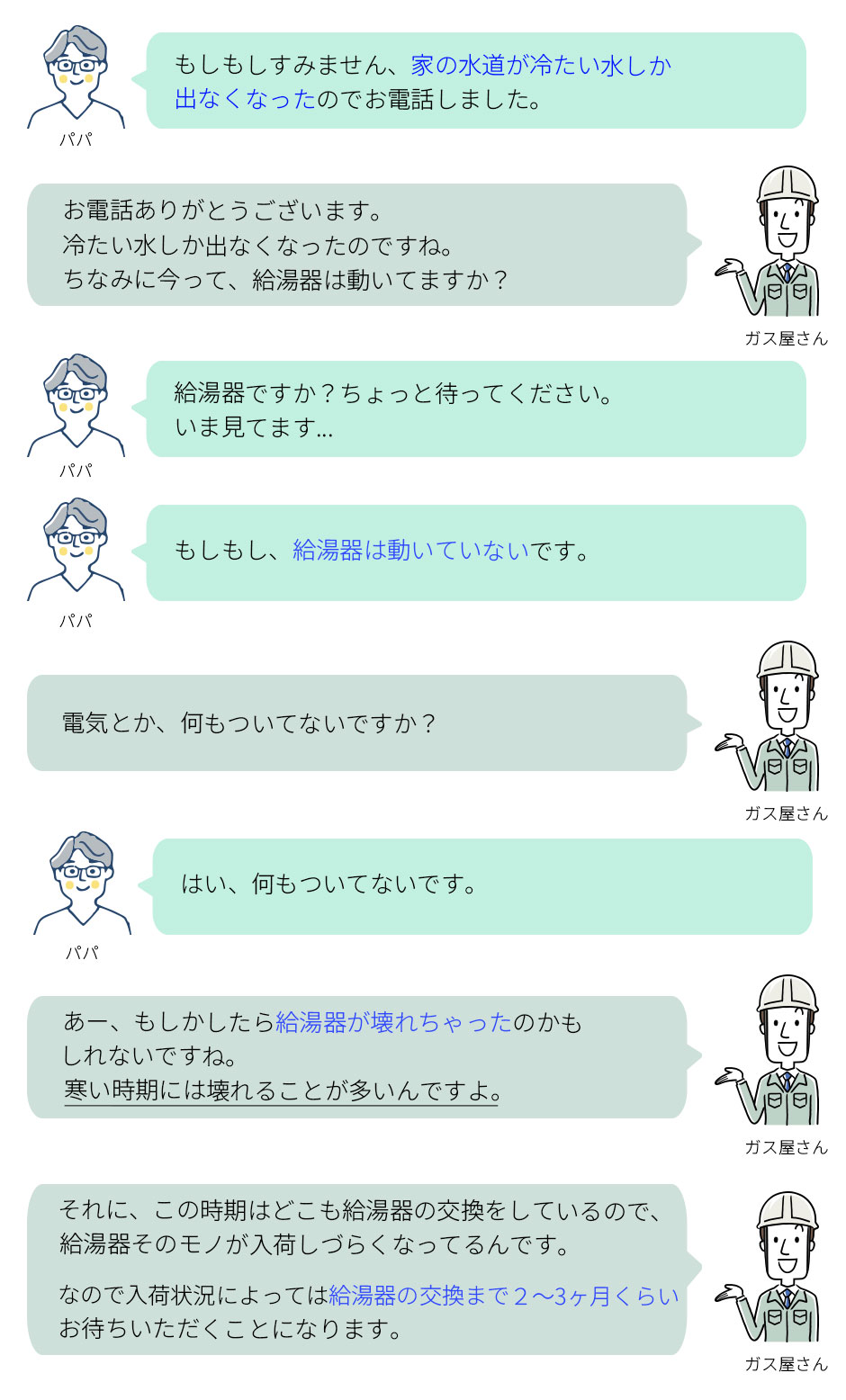 パパにお願いしてもう一度ガス屋さんに電話してもらったところ、やっと電話が繋がったんです!!